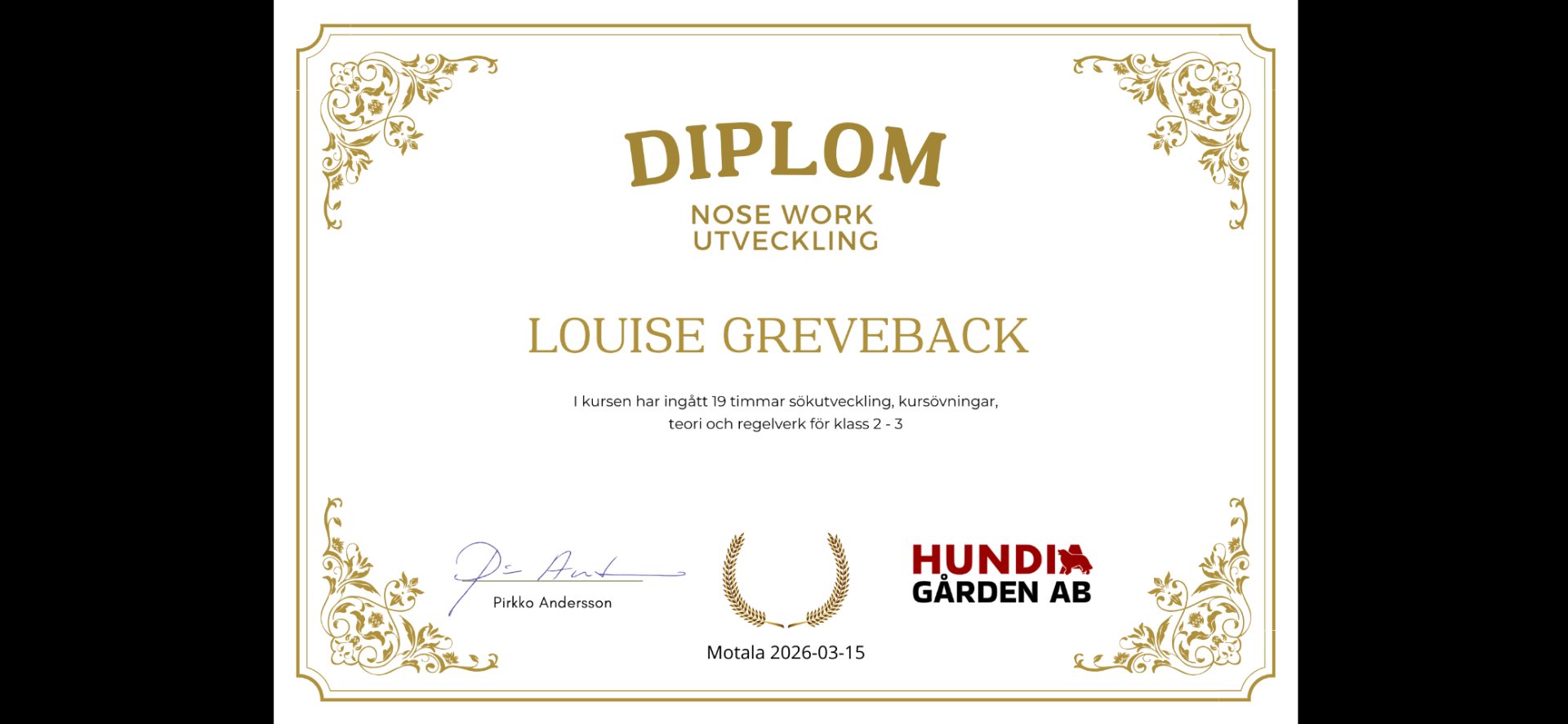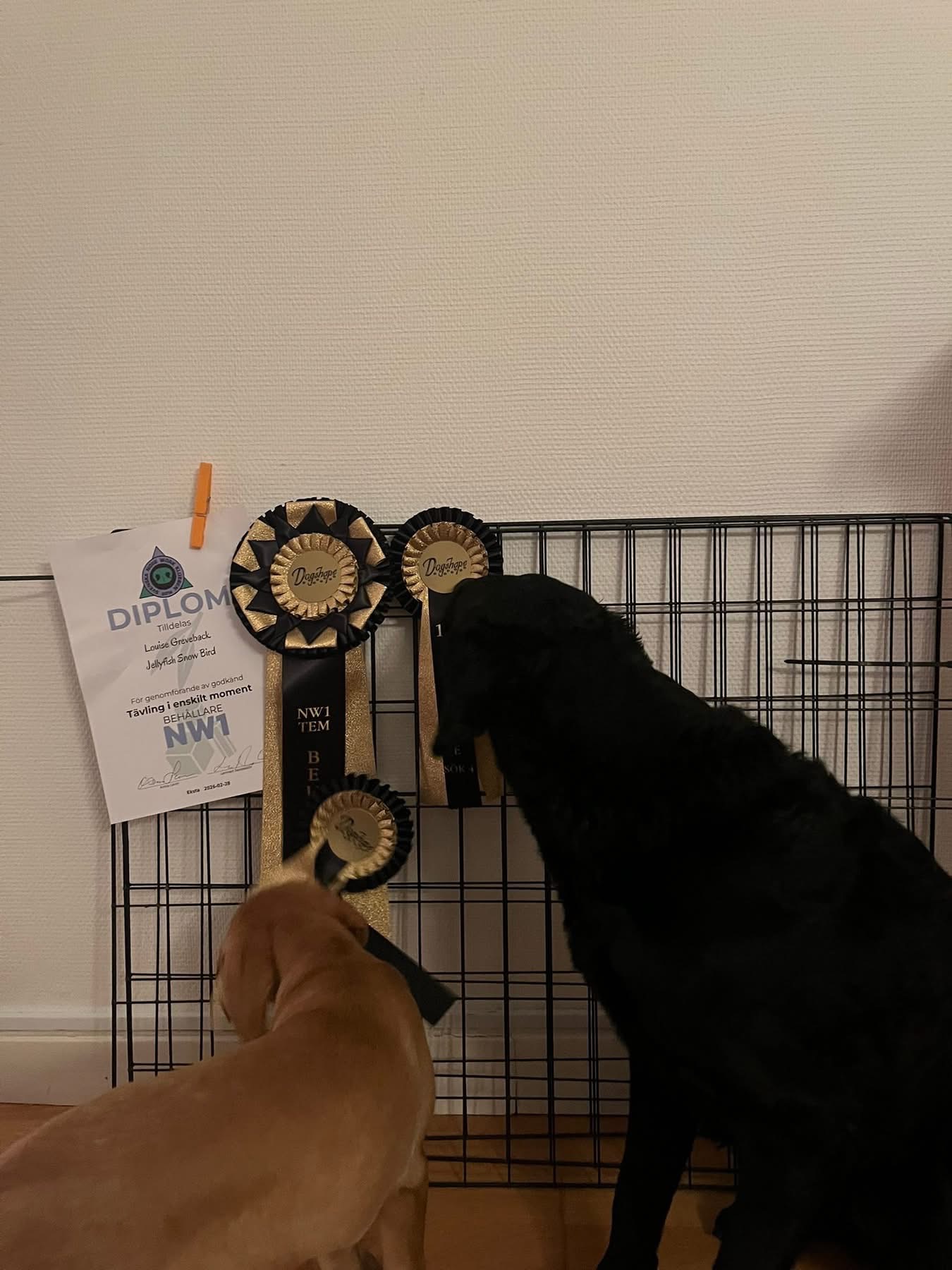 Idag tog Åska och jag ledigt från valpen och åkte och tävlade hos Dogshape. Det var vår första tävling i NW TEM1 Behållare. Åska var i toppform det blev Diplom ett SSE, 2:a i ett sök, 1:a i ett sök och 1:a i totalen. Det är en sån glädje i hennes sök. Sen var det hem och busa med linslusen och vila med storasyster...